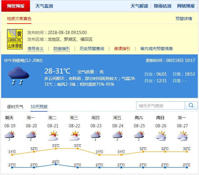 深圳市气象台预计,18日深圳多云间阴天,有阵雨,部分时间雨势较大,气温26-30℃;19日多云有阵雨或雷阵雨;20-23日多云,有短时阵雨,阳光增多,天气趋于炎热。