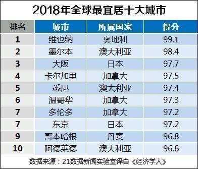 排在全球宜居城市前十位的是:奥地利维也纳,澳大利亚墨尔本,日本大阪,加拿大卡尔加里,澳大利亚悉尼,加拿大温哥华,加拿大多伦多,日本东京,丹麦哥本哈根,澳大利亚阿得雷德。