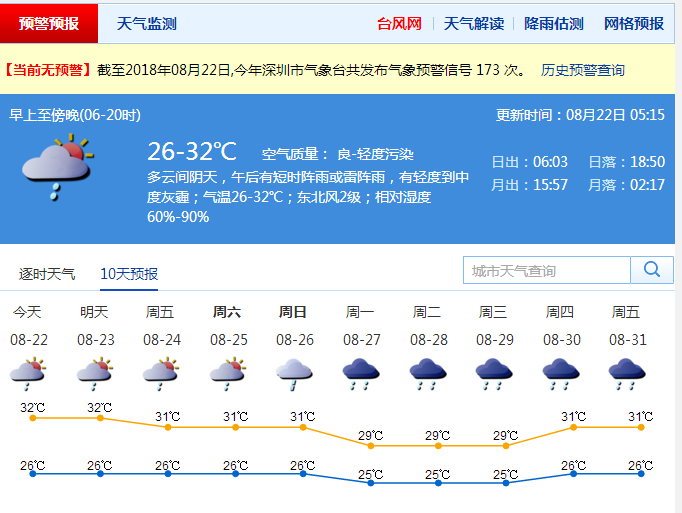 深圳新闻网讯 灰霾、阵雨齐上阵。多云仍是今日天气的主格调,午后还会出现短时阵雨或雷雨。部分时间仍有轻度到中度灰霾,能见度下降至10公里以内。气温依旧较高,最低气温在26℃左右,最高气温升至32℃左右,市民应注意防暑降温。