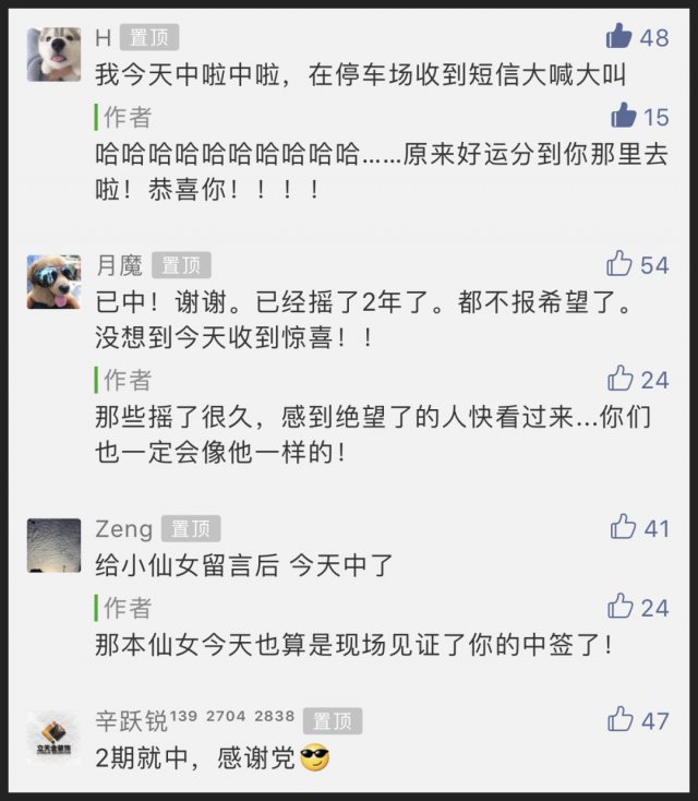 每期摇号当天,都有不少摇号大军在本仙女推送的关于公布摇号结果的文章底下留言上墙,以求下期中签,这一年多来,竟也成了摇号大军们约定俗成的小传统!