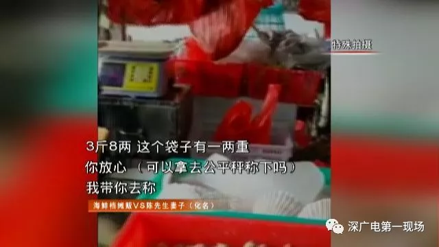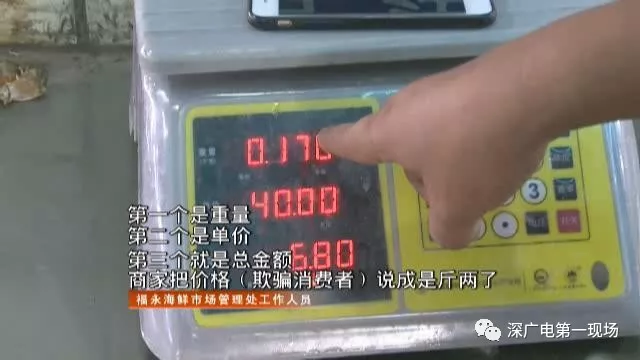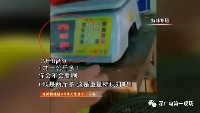 陈先生表示,实际上,刚刚拿去公平称上的龙虾只有1.29公斤左右,大约2斤6两,和这位海鲜档摊贩所说的3斤8两,差了一斤多。