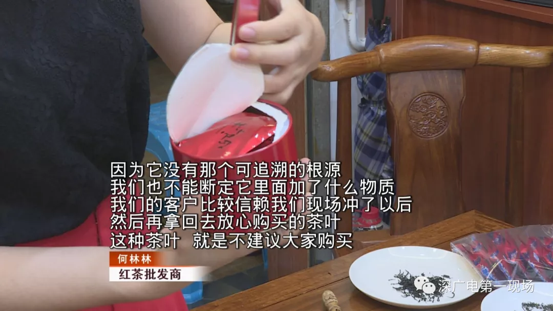 店家介绍,这些看似上档次的包装,也不过是最普通的包装盒,平常大家取茶一般从口上打开有一层一次性包装纸,但行家一眼便知,卖茶者只是从底部打开分装的。而茶盒上只显示茶叶名称,并没有生产日期和具体生产厂家信息,属于三无产品。