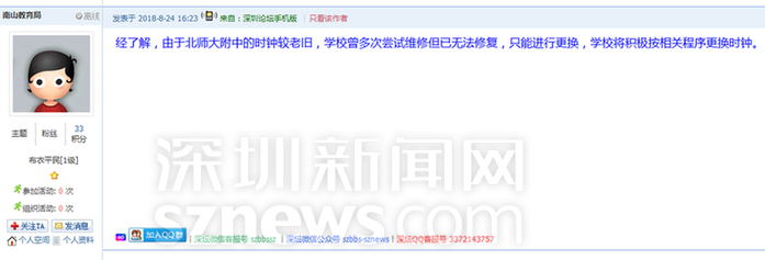截至记者发稿时,南山教育局已在深圳论坛上,对南山北师大附中的户外钟表停摆一事作出回复。该局称,由于户外钟表较老旧,南山北师大附中曾多次尝试维修但已无法修复,该校将积极按相关程序更换。