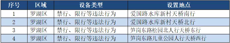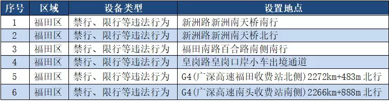另外,重点整治机动车禁行、限行等多种违法行为的交通技术监控设备,深圳交警公布启用87套。涉及福田区、罗湖区、南山区、宝安区、龙岗区、龙华区、光明新区、坪山区、大鹏新区等9个区域。