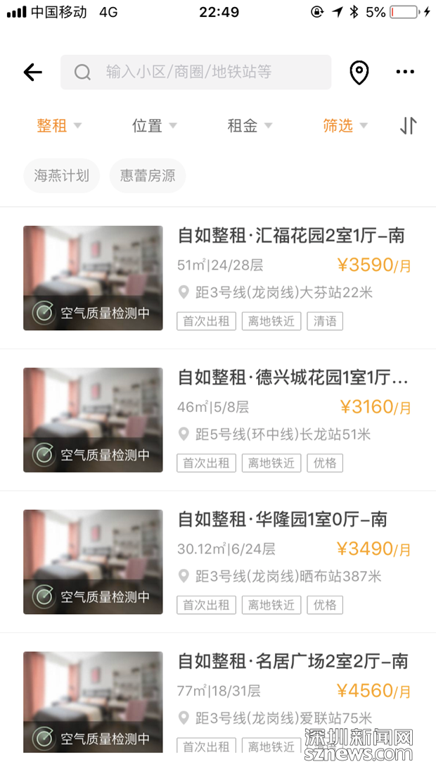 记者发现,目前部分“首租房”已经出租。据了解,位于龙华区红山地铁站附近的华业玫瑰四季二期于2018年交房,但已有自如租客正式入住。刚搬进该小区自如公寓的林女士对所居住的房间担忧不已。她告诉记者,前几日看到自如公寓甲醛超标的新闻深感惶恐,“很怕!我就打算今晚回去测一下,看各项指标怎么样,然后再决定如何处理。”