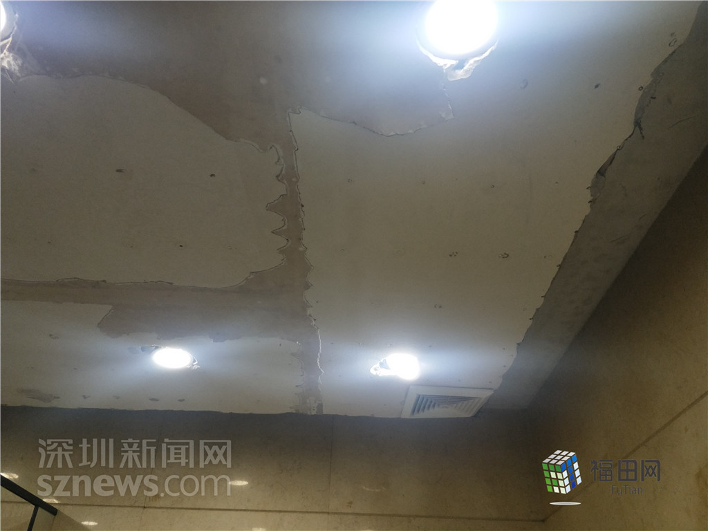 购物公园负一楼公厕由于使用年代较久,天花板破旧。