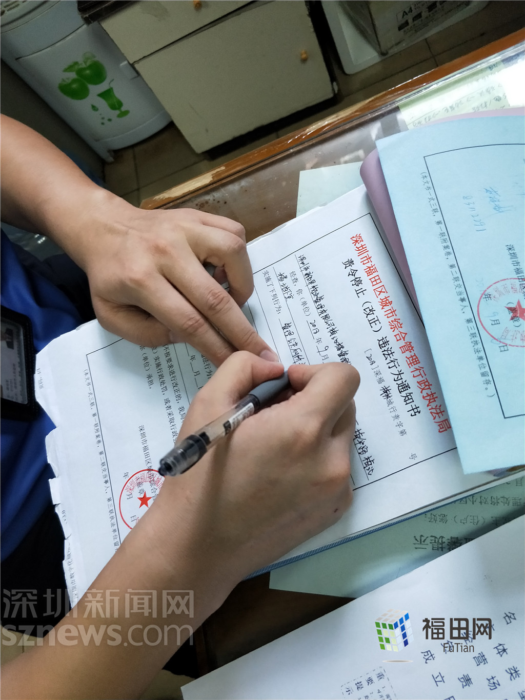 福田街道执法队给购物公园管理处开具责令停止(改正)违法行为通知书。