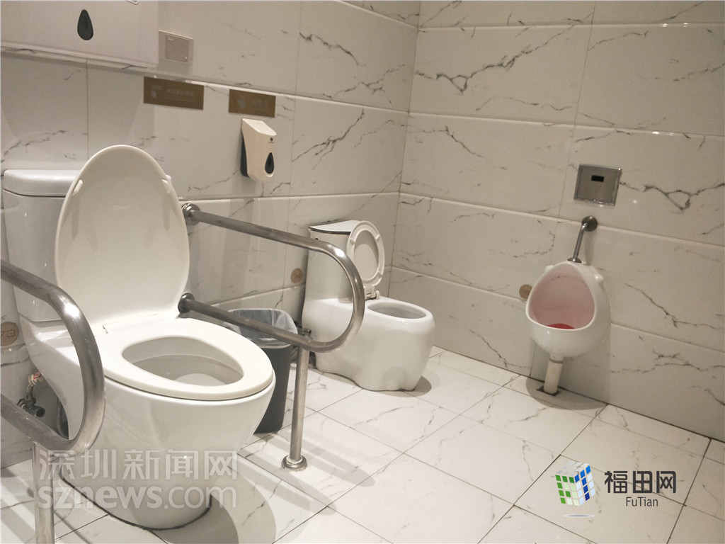 直播的第三站来到福田街道的君尚百货,突击检查商场一楼的厕所。记者看到,君尚百货的卫生间十分明亮宽敞,并且配备了无障碍洗手间和婴幼儿盥洗室。婴幼儿盥洗室内,可以看见小一号的马桶和小便池,洗手液也安装在墙面较矮的地方。除此之外,男厕女厕内都比较干净,纸巾、洗手液、烘干机等设备齐全,隔间地面干净,没有发现脏污的地方。