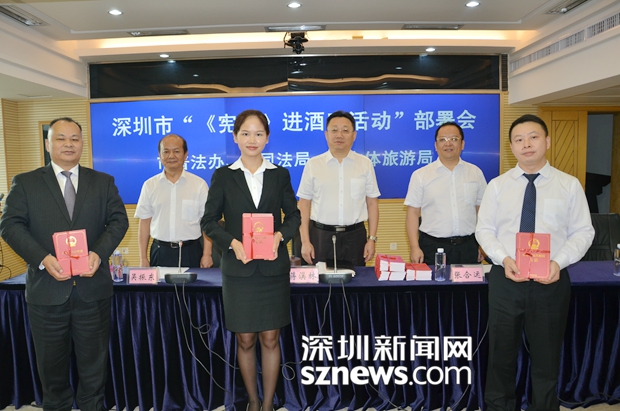 9月6日下午,深圳市普法办、深圳市司法局、深圳市文体旅游局联合开展“《宪法》进五星级酒店”活动,深圳市司法局局长蒋溪林、市文体旅游局局长张合运向24家五星级酒店的总经理送上《中华人民共和国宪法》单行本。
