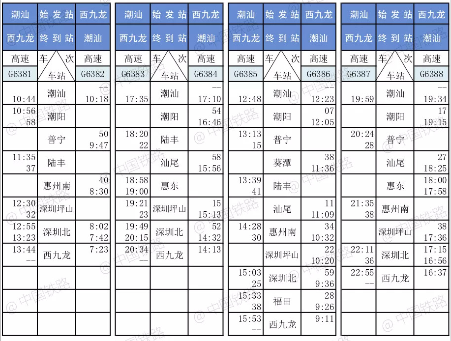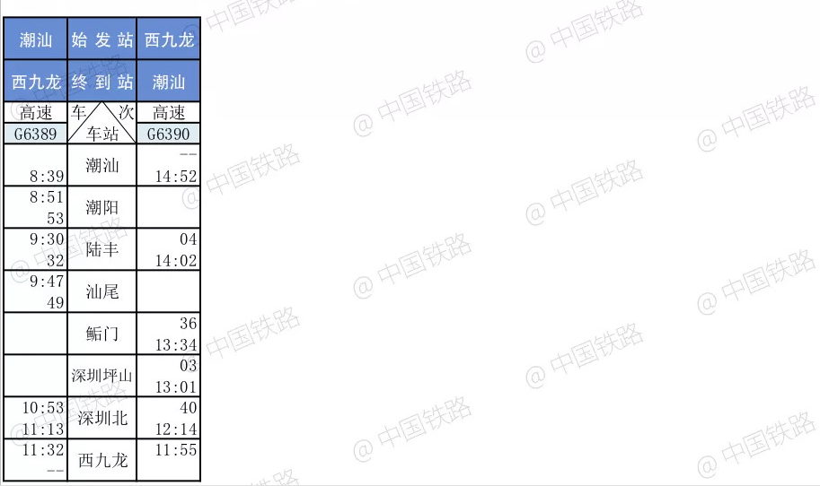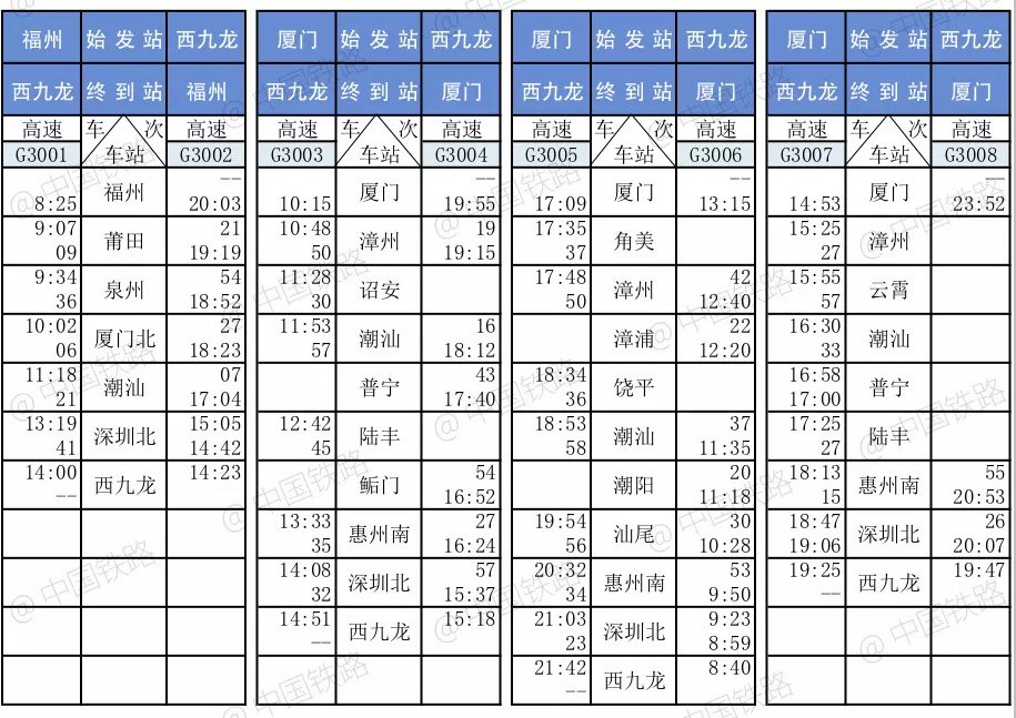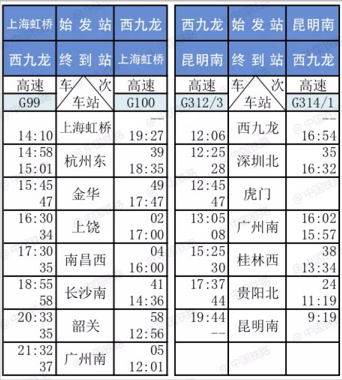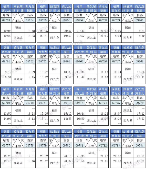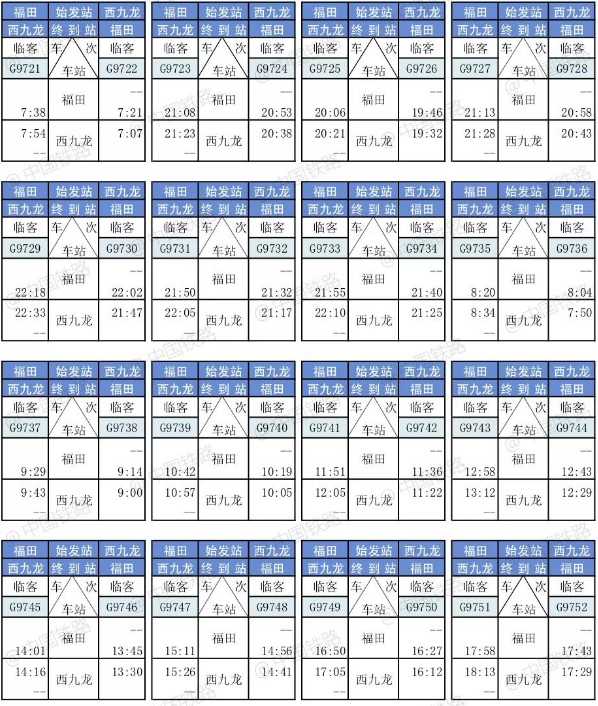 香港西九龙高铁列车时刻表