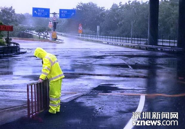 边检民警冒雨在强台风中固定好引导分流铁马
