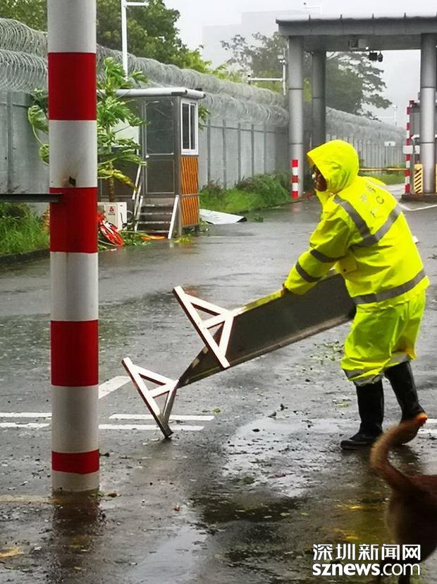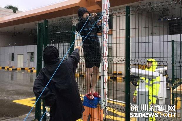 边检民警冒雨在拾取被强台风掀倒现场通关标识牌