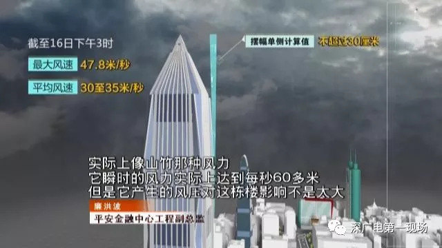 截至16日下午3时,监测到台风‘山竹’的最大风速为47.8米/秒,平均风速为30至35米/秒。根据监测数据推算,塔顶摆幅不超过单侧30厘米,也就是说还不到设计值的50%。