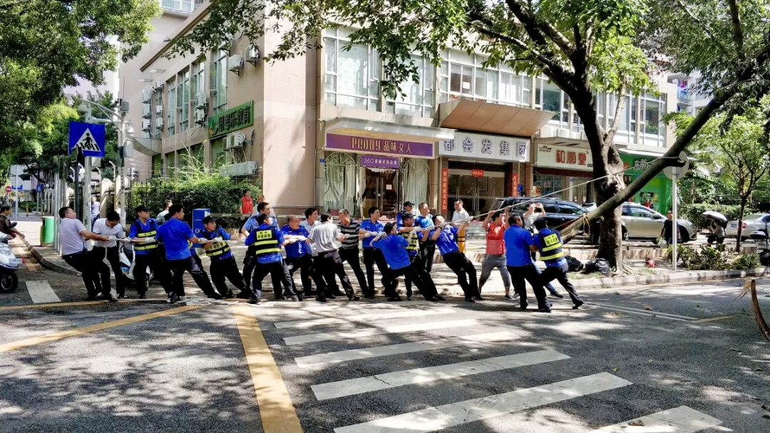 9月19日上午,福田区百花二路、三路,60多名身着蓝色制服的警察和红色马甲的辅警格外显眼,他们正在挥汗如雨地进行灾后路障清理工作。
