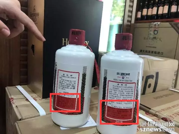 左边为出口版茅台,有中英文标签,执法人员称不允许在国内流通,或涉嫌走私;右边的只有中文标签的,为允许在国内流通的茅台酒。市民朋友们购买茅台时需留意。