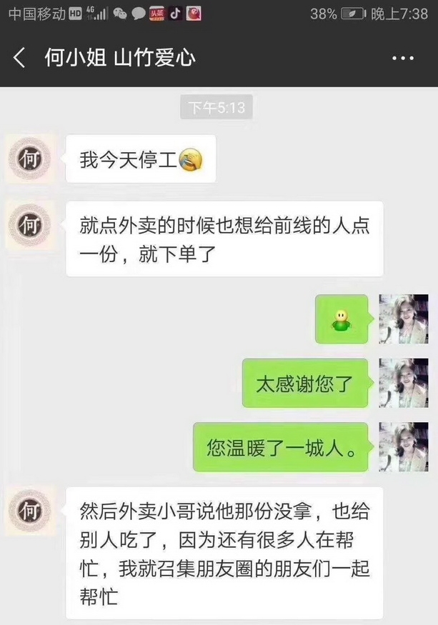 还有为这些前线工人送爱心外卖订单的“何女士”