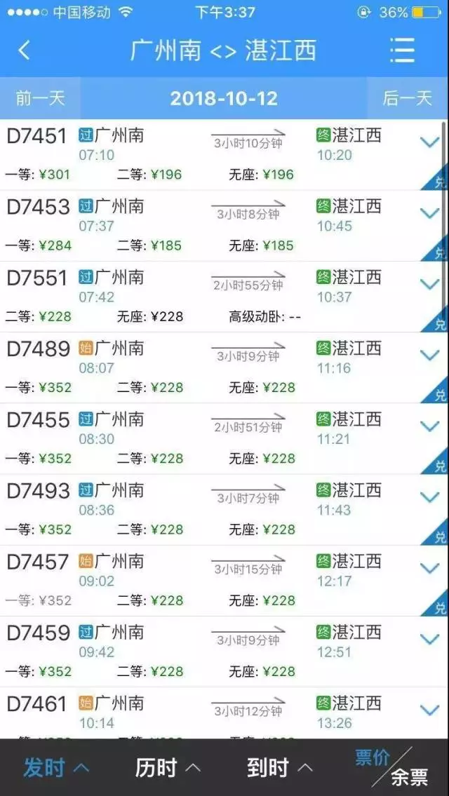 D7453次(7点37分班次)由原来的228元调整为185元;