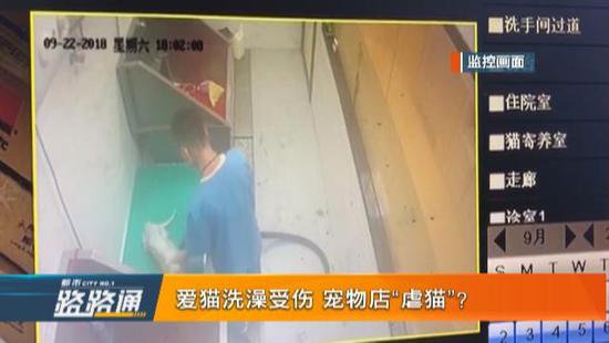 调取监控后发现,当时给猫吹毛的工作人员动作粗暴,在猫只抗拒躲闪的时候,有拖拽的动作,期间还把猫腾空甩起头撞到墙上。