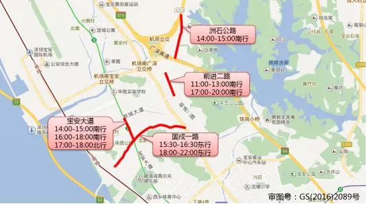 宝安大道(14:00-15:00南行、16:00-18:00南行、17:00-18:00北行)