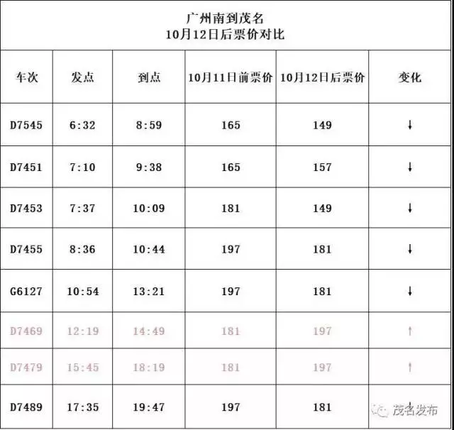 D7451次(7点10分班次)由原来的206元调整为196元;