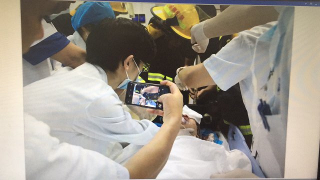 9月28日上午10时,福田大队梅林中队接到报警,称一男子不慎被钢筋穿刺正上方头部,因头部外面露出的钢筋过长,导致急救工作无法进行。梅林中队迅即调动正在医院附近训练的一组官兵携带装备赶到北大医院急诊科,发现伤员大约30岁左右,身高约1.7米,头顶露出约40厘米长的一截钢筋。在检查完伤员受伤部位后,凭借过硬的业务技能,救援官兵仅用几分钟时间便剪断钢筋,医院随即对伤员开展急救。截至记者发稿时,因抢救仍在进行,院方暂未披露伤员具体情况。(记者李晶川)