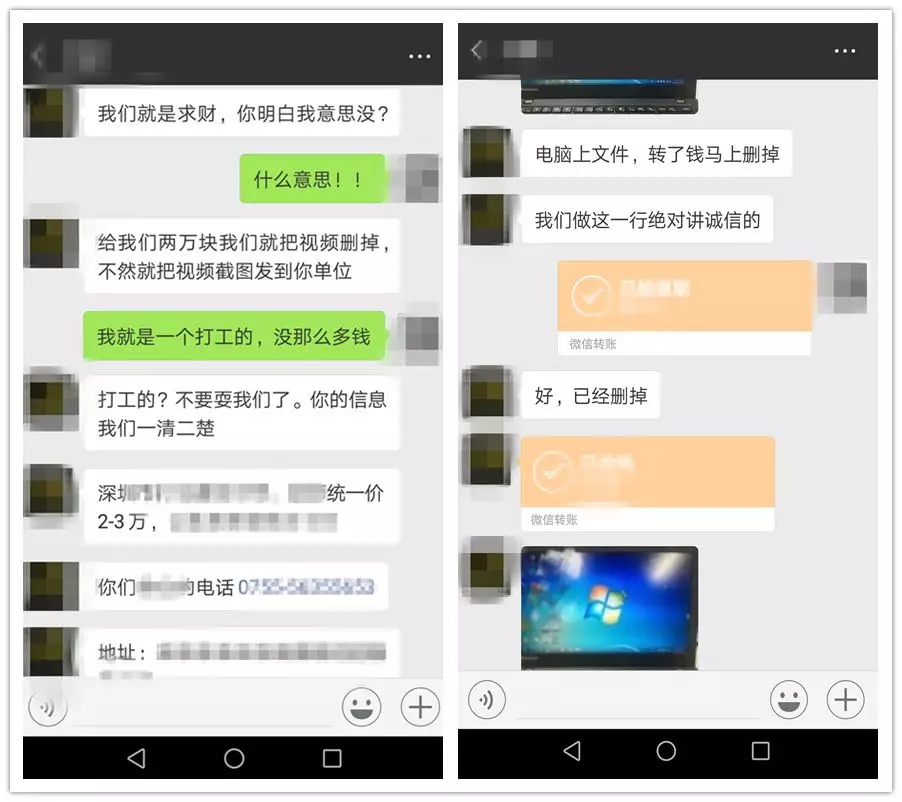 视频聊天后的第二天,另外一名陌生男子加了陈先生的微信。“一上来就把聊天记录和视频聊天的截图发给我,让我转2万元,不然就把裸照发到我的单位。”