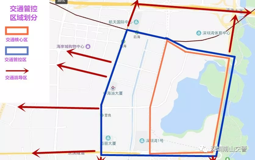 交通管理区外围相应的滨海大道、科苑南路(滨海以北段)、沙河西路(滨海以北段)、海德三道(后海滨以西段)、登良路(后海滨以西段)、创业路(后海滨以西段)、后海滨路、望海路等道路。