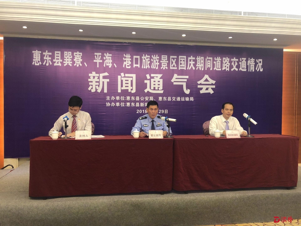 9月29日上午,惠东县举行巽寮、平海、港口旅游景区国庆期间道路交通情况新闻通气会,通报通往巽寮、平海、港口等滨海旅游景区的道路X213线、X210线道路路况,以及国庆黄金周期间景区的道路交通状况预判情况及出行提示、交通管制等情况。
