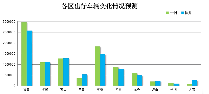 除以上两个区域外,我市其余各区车辆会较平日有所下降,而原关外的福田、宝安、龙岗,出行车辆数下降较为明显,整体来看,全市出行车辆数将减少6%。