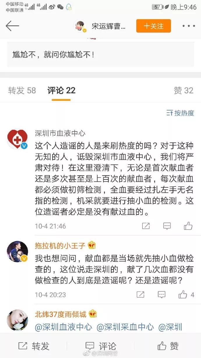 这个人造谣的人是来刷热度的吗?对于这种无知的人,诋毁深圳市血液中心,我们将严肃对待!在这里澄清下,无论是首次献血者还是多次甚至是上百次的献血者,每次献血都必须做初筛检测,全血要经过扎左手无名指的检测,机采就要进行抽小血的检测。这位造谣者必定是没有献过血的。