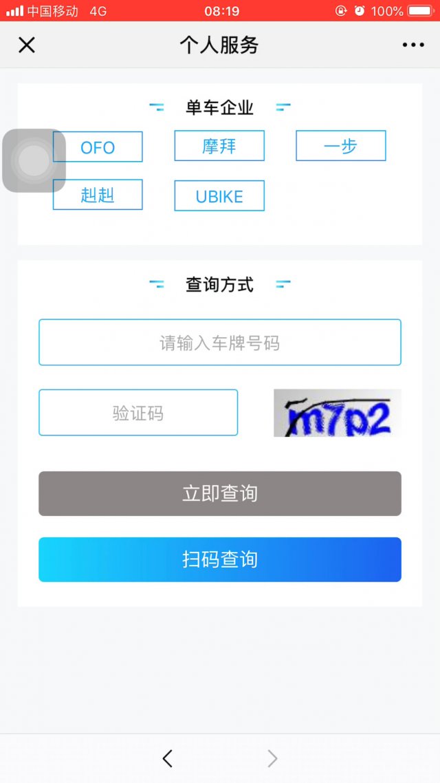 提交完手机号和验证码之后,我们就来到了这个页面,在这里,你可以选择你要查询的共享单车的品牌,品牌选择完毕后,你可以选择手动输入车牌号码或扫码查询!