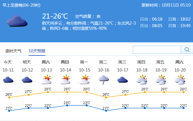 受弱冷空气影响,预计11~12日有分散小雨,其中11日气温20 ℃ ~27 ℃。12日持续阴天,有分散阵雨,气温21 ℃ ~27 ℃。预计此次弱冷空气影响持续到周末,13~15日晴天到多云,气温开始回升。16日将有新一轮冷空气进入深圳,有一次降雨过程。