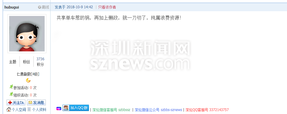 在深圳不断推进的城市建设进程中,共享单车的祸,就不应该由全体市民来“埋单”,更不应该以牺牲市民的幸福感作为“除祸”的妙招。我们都期待,未来的深圳能用更合理、更人性化的措施,代替简单粗暴的“一刀切”。