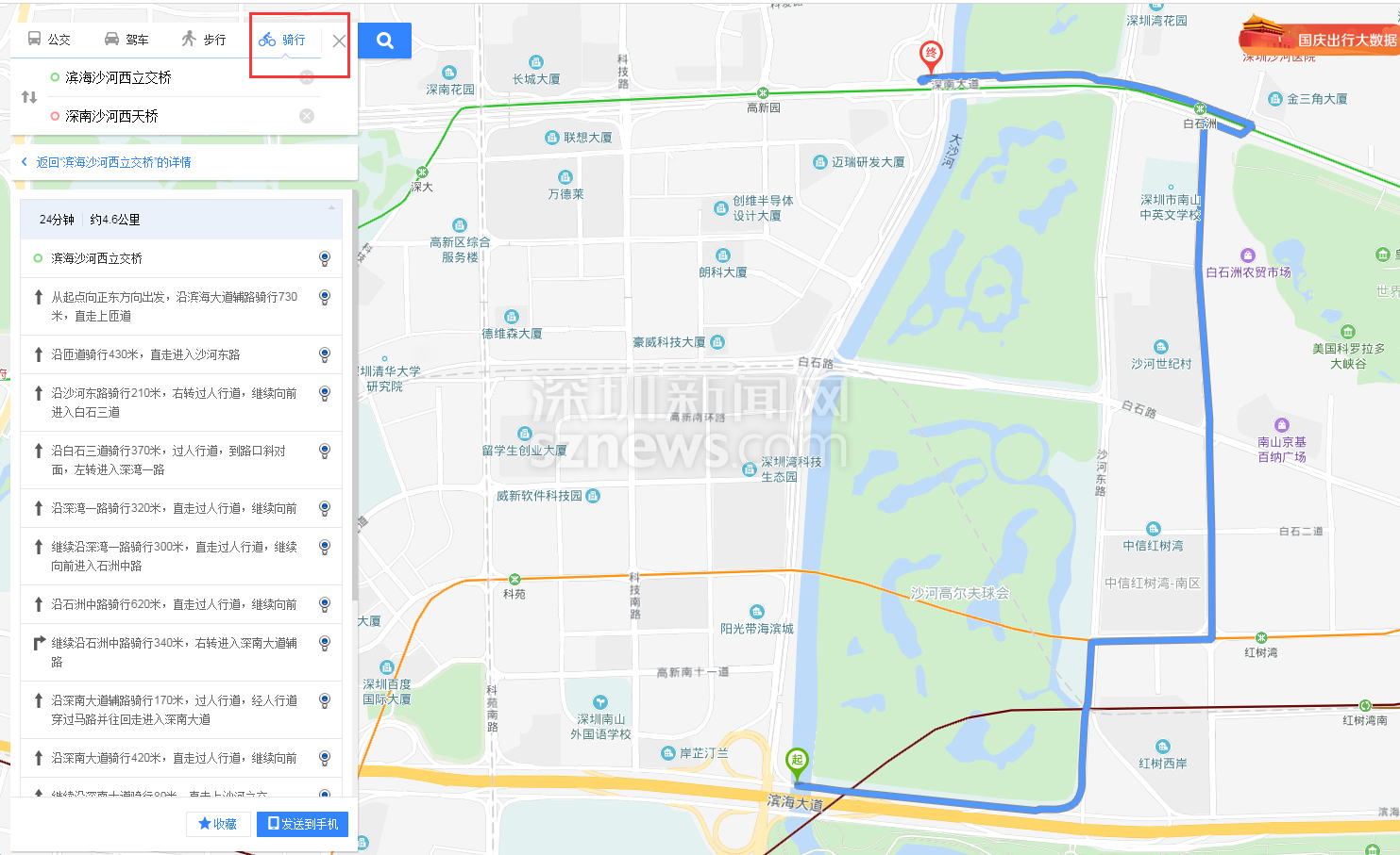 百度地图中滨海沙河西立交到深南沙河西立交的骑行路线