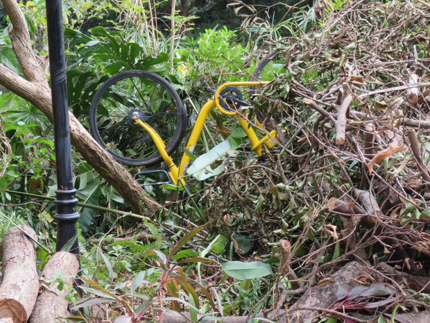 与废弃树枝堆成一团的共享单车 深圳论坛网友“noelam”摄
