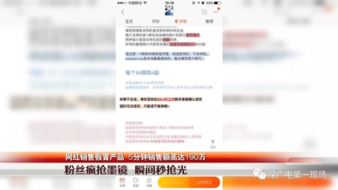 在明知品牌墨镜有问题的情况下,猫娘于某依然在微博上做了预告,称自己通过特殊渠道找到了一批代工厂的墨镜,在吸引到粉丝关注以后,她在自己的网店上线销售。因为墨镜销售价格是正品的三分之一,几千付墨镜上线几分钟就被秒抢光,而这些眼镜其实就是小作坊生产出来的假冒产品。
