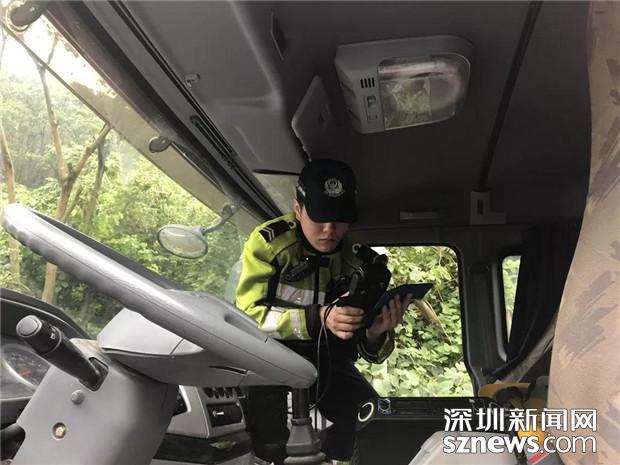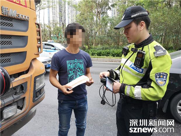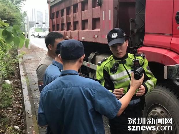 深圳交警民警检查泥头车驾驶员的相关证件