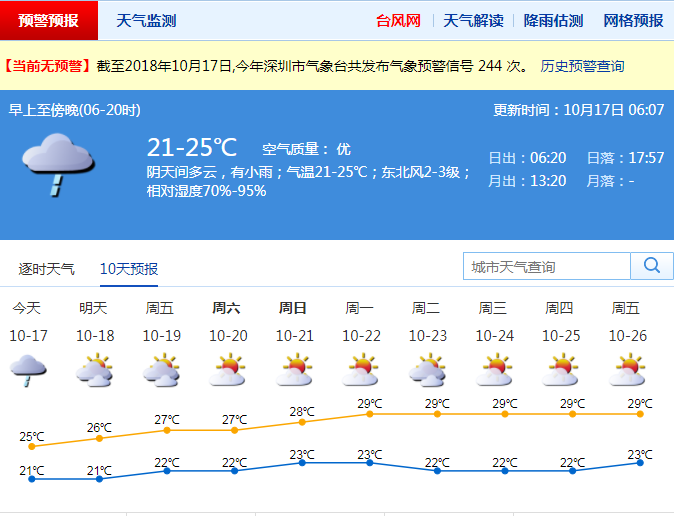 市气象局预计,17日深圳市以阴天间多云为主,有小雨,气温21-25℃,空气渐趋干燥,其中18-20日沿海和高地有6-7级偏东风。