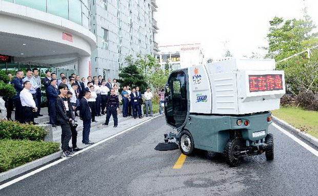 在珠海英搏尔电气股份有限公司,代表团观看新能源纯电动垃圾清扫车作业。