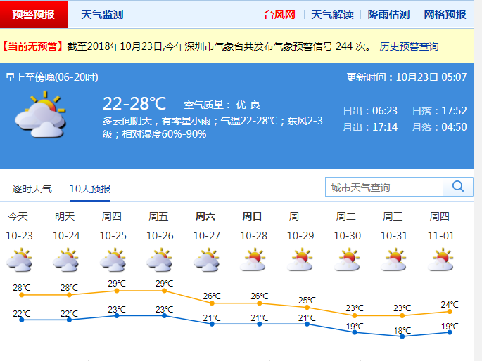 深圳新闻网讯 今年冷空气来得较早,进入10月以来,已有几轮弱冷空气影响深圳,天气明显转凉。预计本周深圳大致多云,最低气温21℃至23℃,今日深圳阴天间多云,有分散小雨,27日受冷空气影响,气温略降。近期早晚清凉,市民要及时添衣保暖。