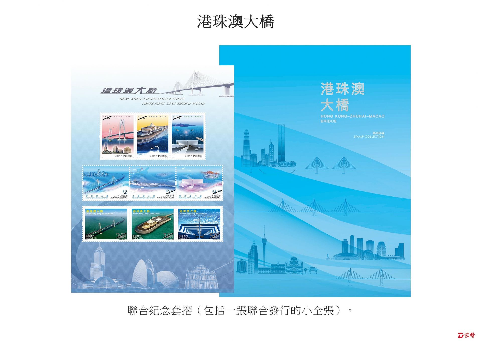 为纪念大桥启用,中国邮政、香港邮政和澳门邮电于同日共同发行一款联合纪念套折,内附一张小全张,嵌有由三地邮政发行的特别邮票各一套。