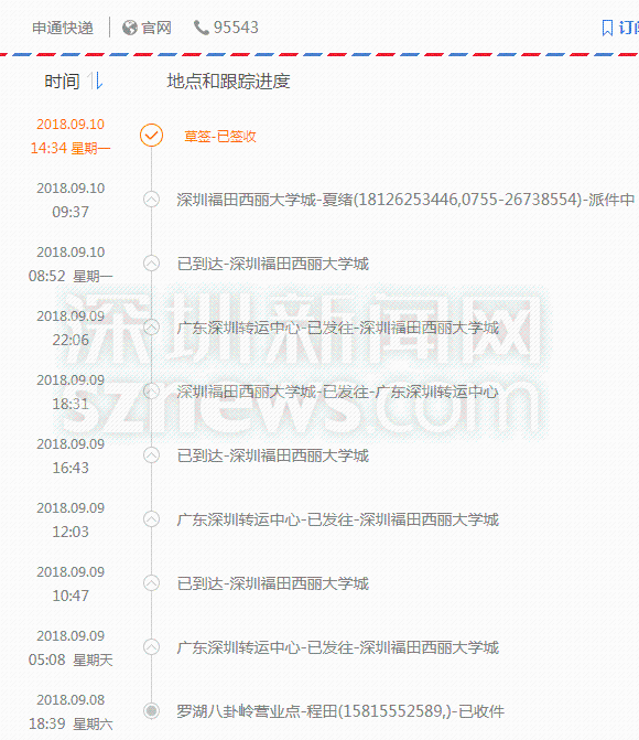 本次200位神秘顾客还对十家快递的派送时长进行体验,结果发现申通快递派送时长最长,同城快件从9月8日收件,到9月10日才派送。