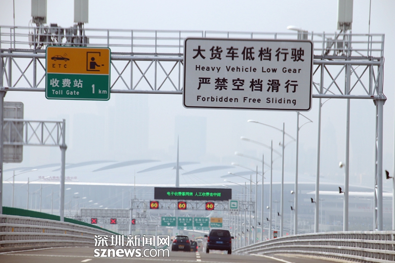 距离珠海收费站还有1公里,这里是一段下坡,指示牌提醒严禁空档滑行