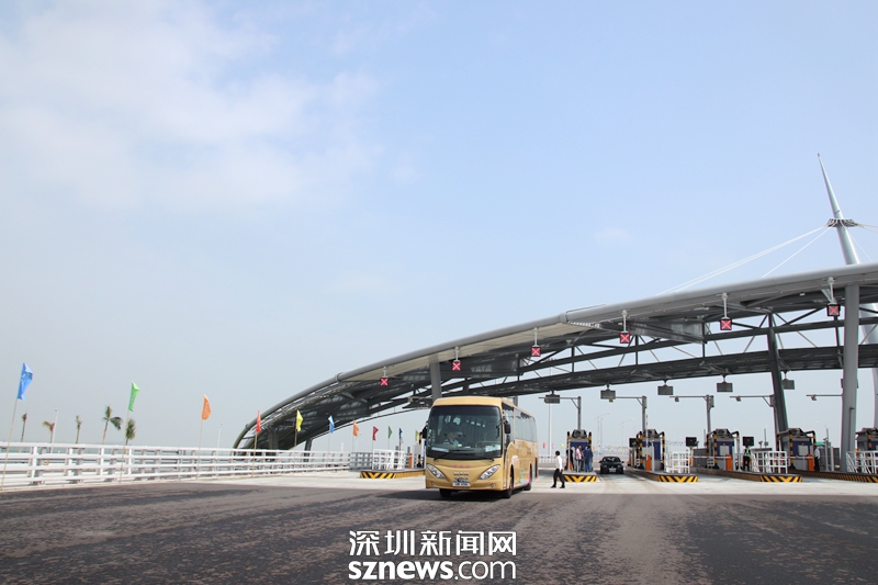 一辆穿梭巴士经过港珠澳大桥珠海收费站