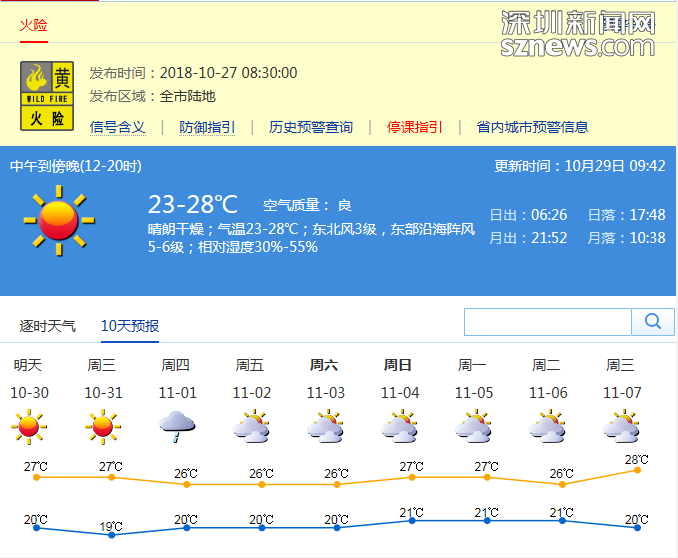 记者从深圳市气象局了解到,29日,深圳市晴朗干燥;气温在20-28℃;东北风3级,阵风5-6级;相对湿度30%-70%。火险预警信号生效中。