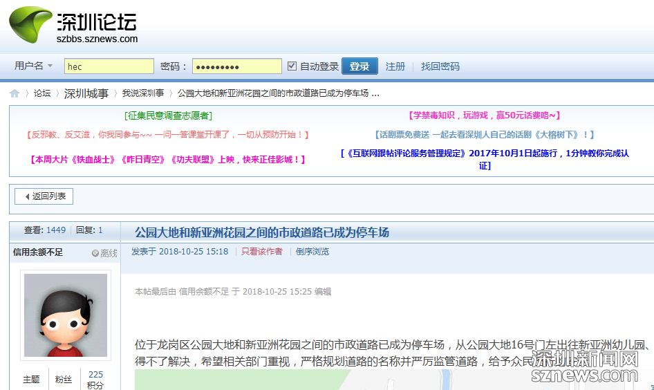 深圳新闻网10月30日讯(记者 何畅)近日,网友“信用余额不足”在深圳论坛发帖称龙岗区“公园大地和新亚洲花园之间的市政道路已成为停车场”,对此他还吐槽“投诉过这问题,一直得不了解决,希望相关部门重视”。