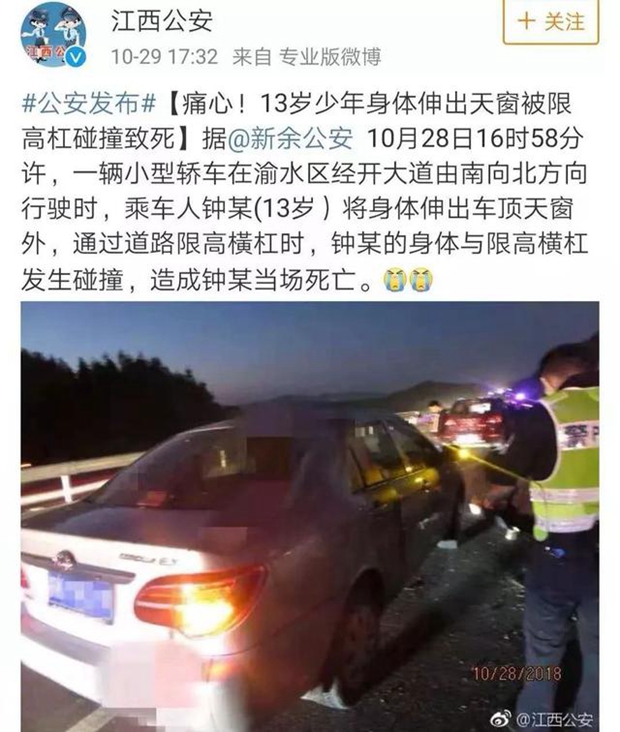 据报道,10月28日16时58分许,新余市渝水区经开大道发生一起交通事故。驾驶员袁某驾驶一辆小型轿车,在经开大道由南向北(良山镇往新余市区)方向行驶时,乘车人钟某(13岁)将身体伸出车顶天窗外,当车辆行驶至良山镇八百桥村委里元村路段,通过道路限高橫杠时,钟某的身体与限高横杠发生碰撞,造成钟某当场死亡。(相关报道:悲剧!一少年头伸出车天窗被限高杠撞亡)