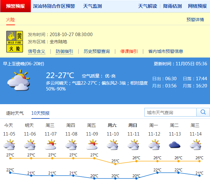 5日,深圳将以多云天气为主,部分时间可见阳光。白天气温回升,最高气温在27度左右。早晚天气清凉,最低气温在22度左右,温差增大,市民应注意预防疾病。