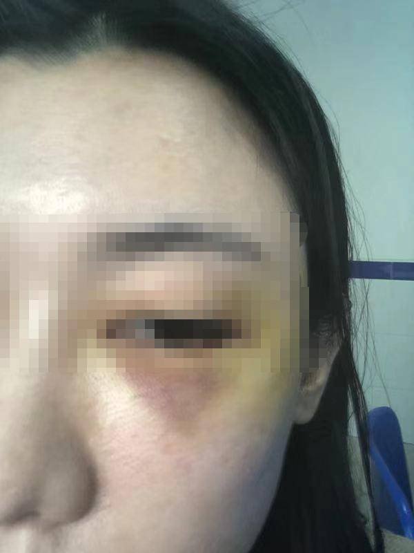 根据照片显示,李小姐左眼下有一块明显淤青的部位,她表示,这是对方用手机尖锐部反复砸她脸部所受到的伤。因为脸部受伤,目前她只能暂停工作。