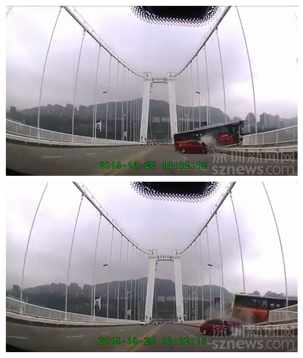 重庆22路公交坠江瞬间视频截图来自事发时路过大桥的小汽车行车记录仪